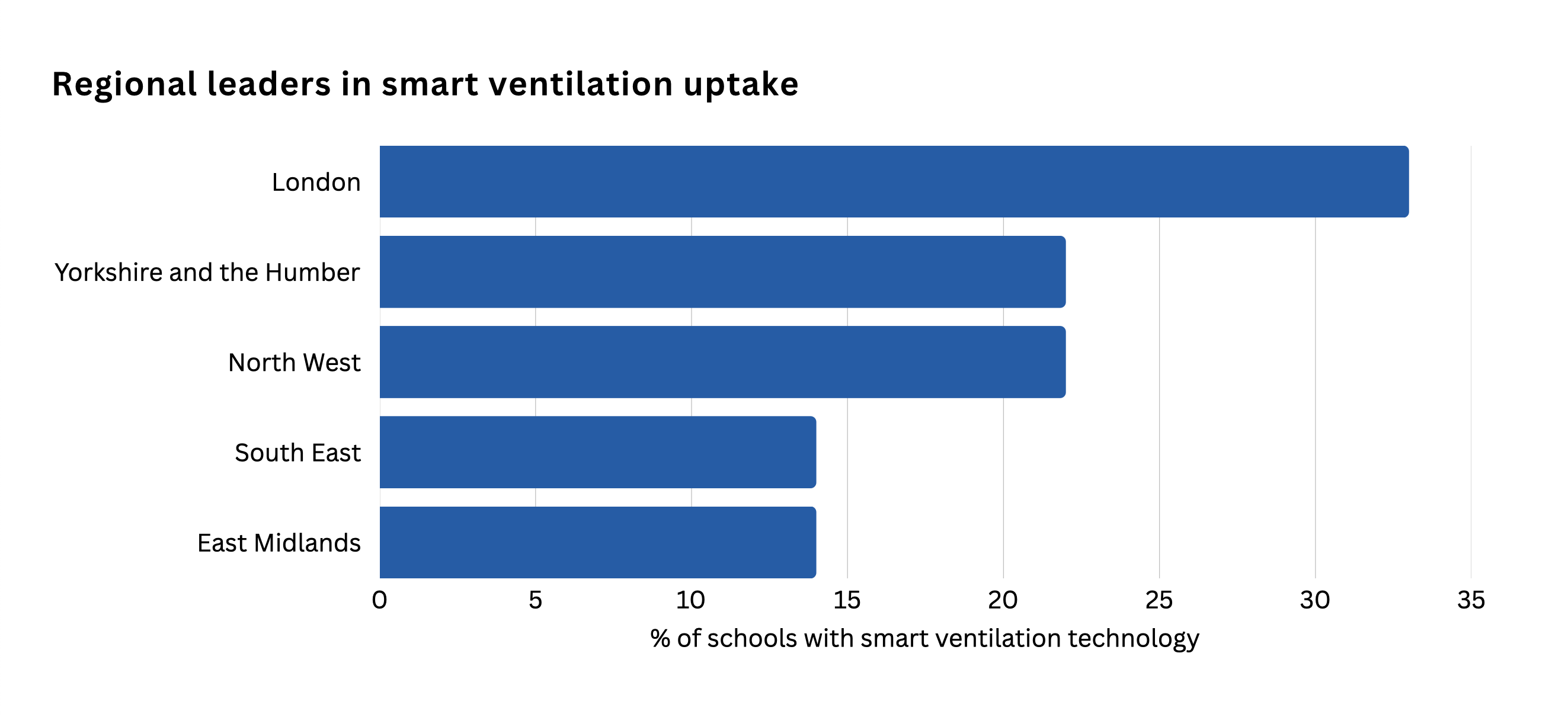 London accounts for a third (33%) of schools with smart ventilation adoption, while the East Midlands and South East each represent 11%.