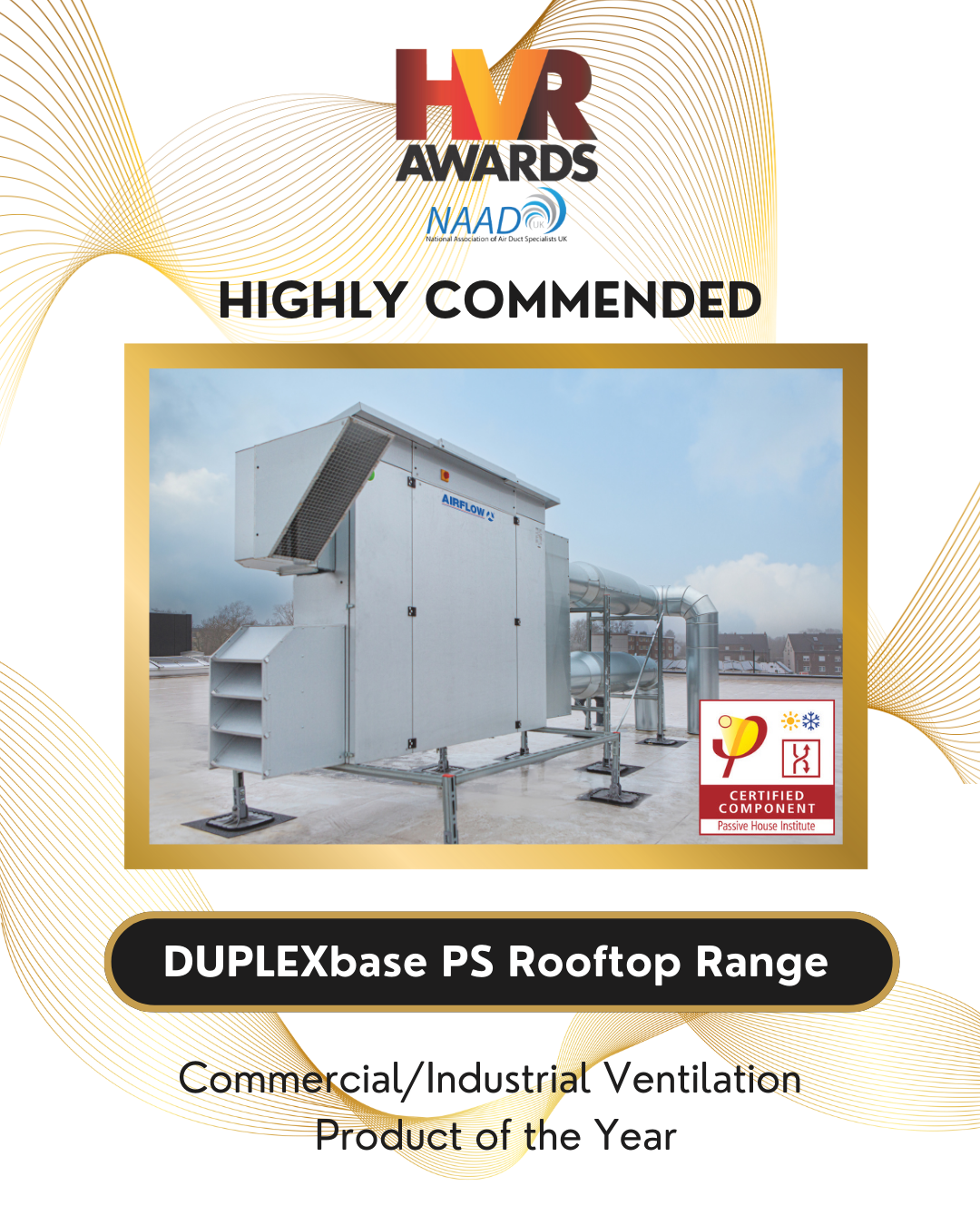At the HVR Awards, our Duplexbase PS Rooftop MVHR received a Highly Commended accolade in the Commercial/Industrial Ventilation Product of the Year category.