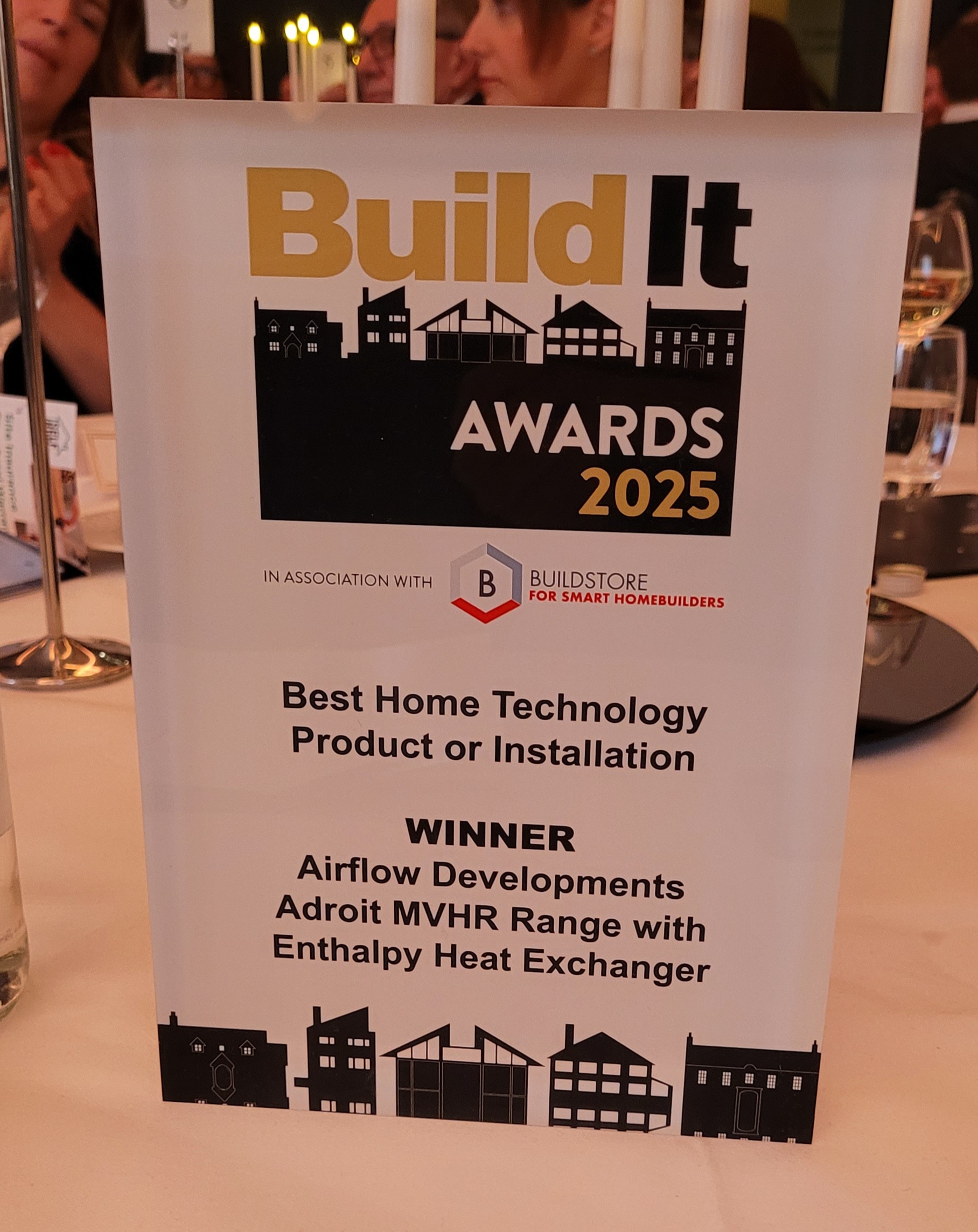 We are proud to have won Best Home Technology Product or Installation at the Build It Awards for our Adroit MVHR range featuring the Enthalpy Heat Exchanger.